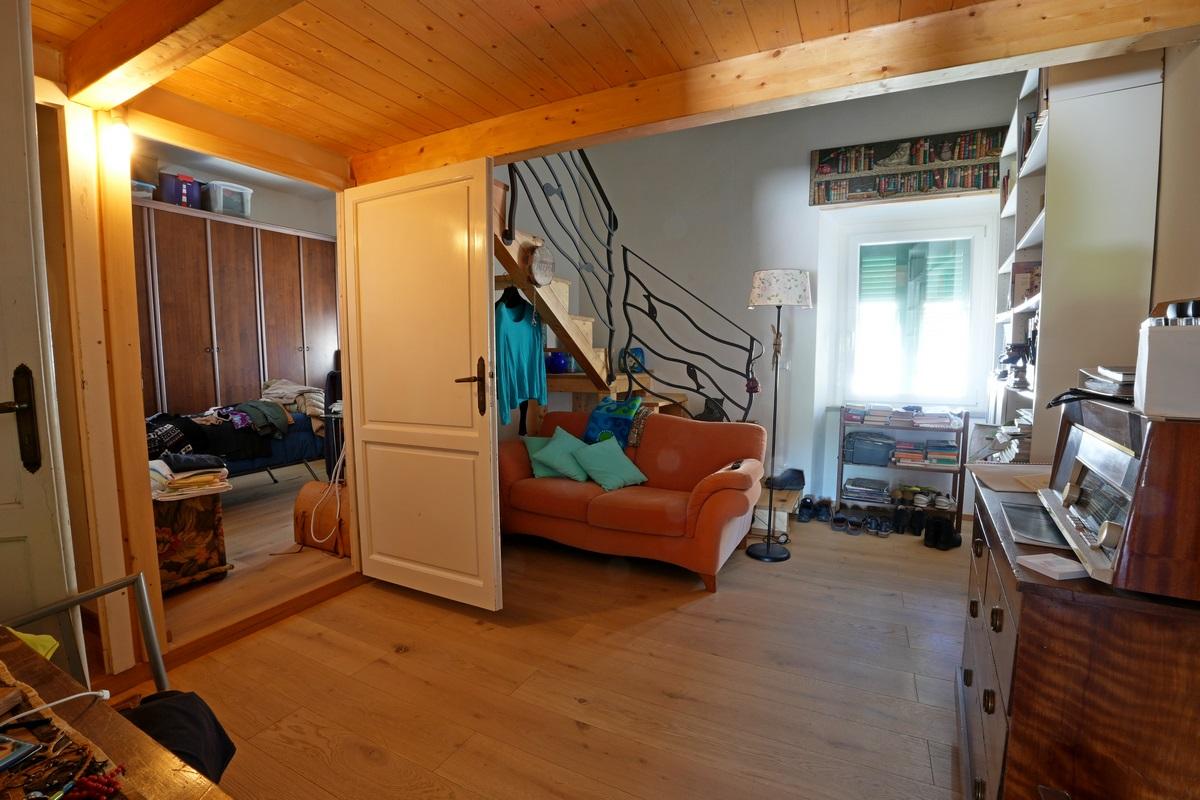Nerenovovaná strana - samostatný vchod do samostatného pokoje (vedle schodiště, za zdí) v patře 2 pokoje a koupelna.